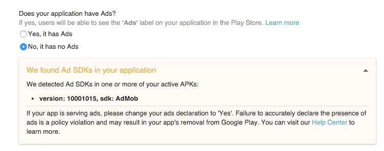 It can also be added unintentionally, which is likely the case if you’ve received the above notice after declaring that your app doesn’t have ads: