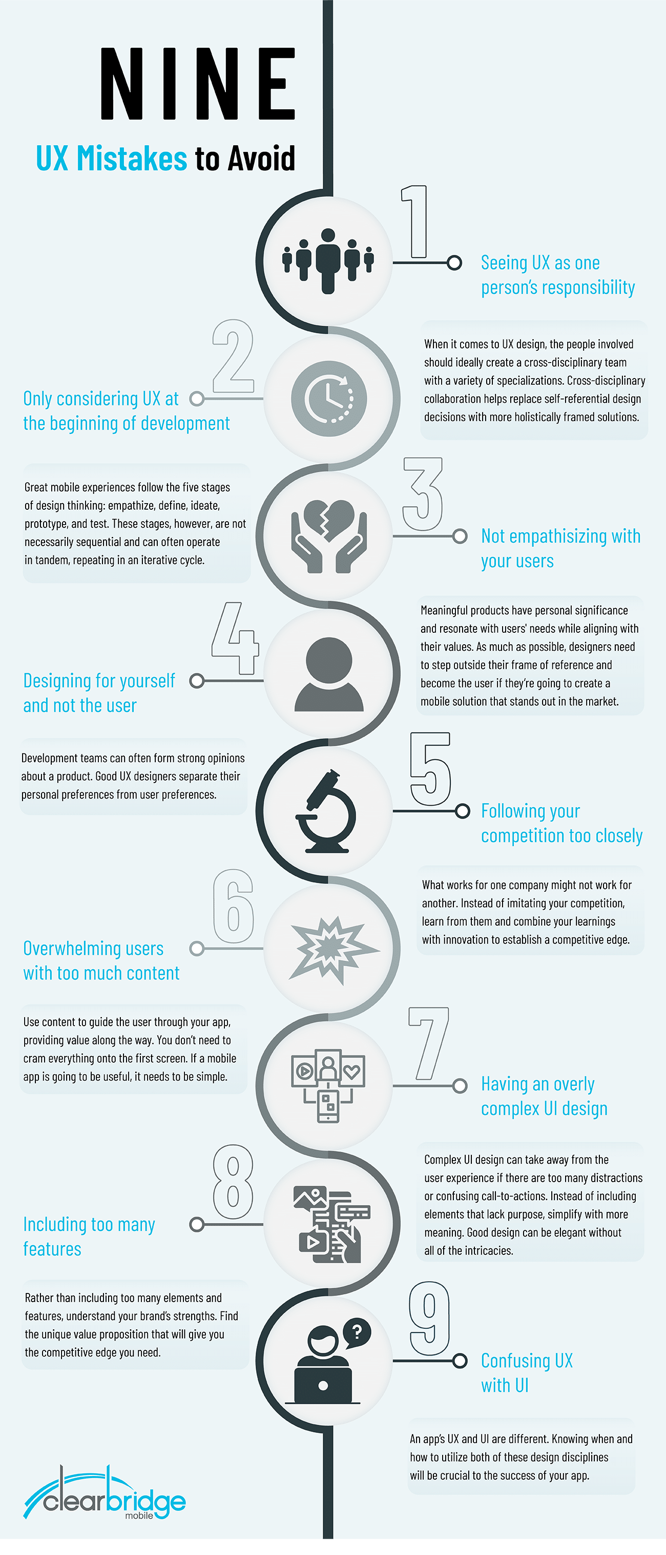 The misunderstanding surrounding UX stems from the overlap of skill-sets and tools involved in both UX and UI design, as well as several common misconceptions about what UX is and how it fits into the mobile app development process. This article will list nine common UX mistakes to avoid in mobile app development and how to use the principles of design thinking to keep UX considerations at the forefront of the entire product lifecycle.