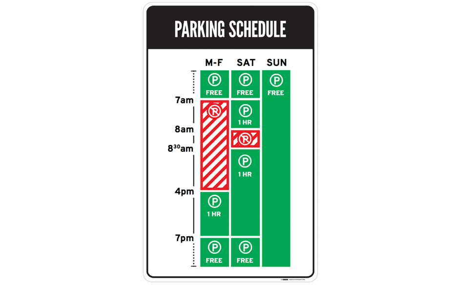 By using visuals instead of text, and making use of conventional understanding (green for yes and red for no), people can instantly process the information from the parking sign. On a Friday afternoon at 4 p.m., parking is allowed.