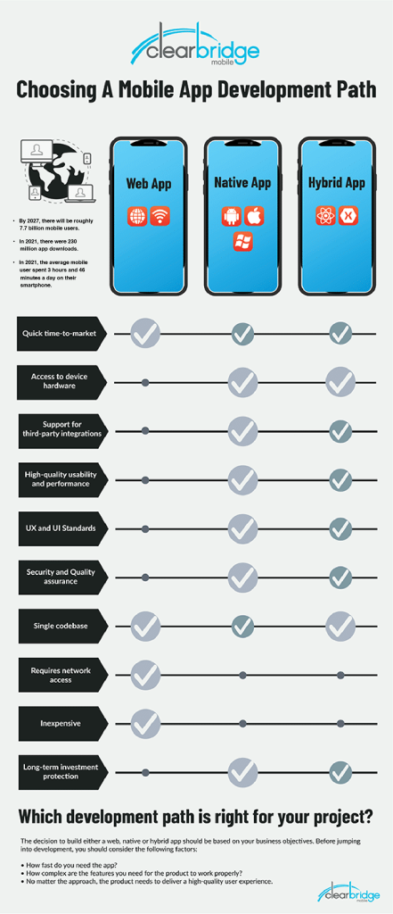The choice of web vs native vs hybrid development is dependent on a number of factors, including business needs, app requirements, developer skill, and timelines. The bottom line is that each type of app offers an entirely different experience and it’s important to know the strengths and weaknesses of each before jumping into development.