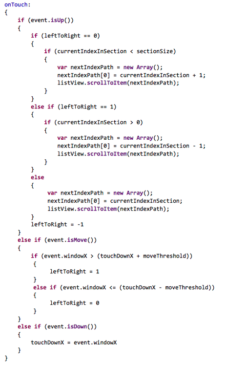 Here is an explanation of what is going on in the code below. By comparing where the users first touch was registered in event.onDown, we track the difference between the current position and the first touch in event.isMove and make a determination about the direction in which the user wishes to scroll the list. When the user lifts their finger in event.isUp, depending on the direction of the scroll which was determined in event.isMove, we select the appropriate “next” image, and call the listView.scrollToItem function which automatically scrolls the list to the desired element.